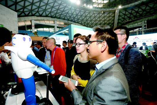 图为:一款可以陪人聊天卖萌的机器人吸引了观众的眼球