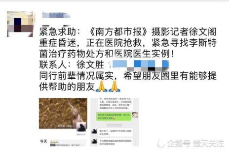 楚天都市报2月4日讯 (记者刘迅 通讯员高星)昨日,诸多媒体群均被一条信息刷屏,“南都摄影记者徐文阁重症昏迷,正在医院抢救:紧急寻找李斯特菌治疗药物处方,及医院医生实例。”文后附上了求助电话。