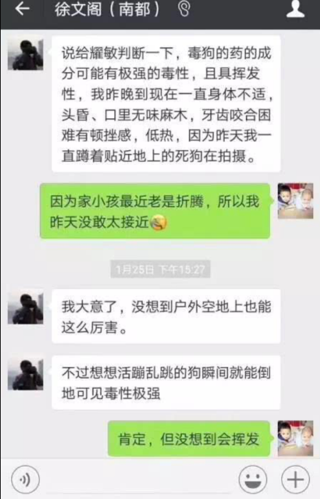 根据网上截图信息,在未昏迷之前,徐文阁曾在拍摄过程中近距离接触被毒到的狗。随后感觉身体不适,头昏、口里无味麻木,牙齿咬合困难有顿挫感,并发低热等症状。在和朋友谈及时,一度怀疑是毒狗的药具备极强的毒性和挥发性,大意之下才使得自己中毒。