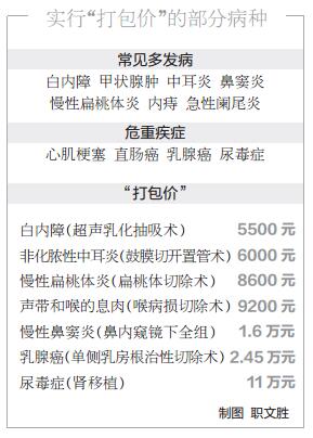 记者梳理发现101种病种中有白内障、甲状腺肿、中耳炎、鼻窦炎、慢性扁桃体炎、内痔、急性阑尾炎等这些市民较熟悉的多发病,还有心肌梗塞、直肠癌、乳腺癌、尿毒症这些危重疾症。“打包价”如白内障(超声乳化抽吸术)5500元,慢性扁桃体炎(扁桃体切除术)8600元,乳腺癌(单侧乳房根治性切除术)24500元,尿毒症(肾移植)11万元等。