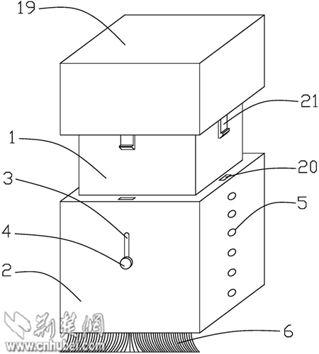 主结构示意图:1—橡皮 2—套壳 3—限位槽 4—推动块 5—第一限位孔 6—软毛刷 19—套盖 21—卡扣