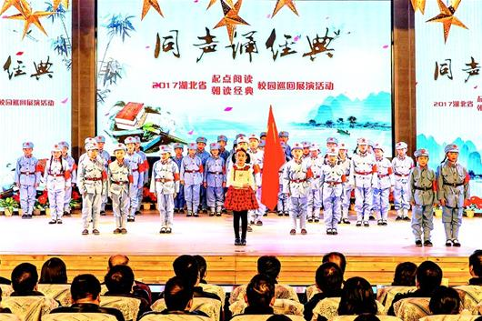 湖北日报讯 (记者文新)雅言传文明,经典润人生。昨日,“同声诵经典——2017湖北省起点阅读·朝读经典”校园巡回展演在武汉瑞景小学启动。伴随着孩子们声情并茂的诵读声,16位小朋友走上舞台点亮地图,标志着巡演活动将走进省内各地。