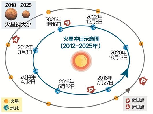 本世纪首次火星大冲发生在2003年,现在火星正一步步靠近地球,将于7月27日再次与地球、太阳连成一线,成为彻夜可见的红星。据悉,今年是五星冲日的年头,木星、土星、火星、海王星、天王星轮番上演冲日大戏。所谓冲日,就是太阳与行星分列地球两侧,且三者在黄道面的投影形成一条直线。当行星冲日时,火星与地球距离相对较近,而且整夜可见,特别适合观测,因此火星冲日也是观测天象的重头戏。“大冲时火星由于与地球距离非常近,看起来明亮而又通红。”省天文学会副秘书长孟宪有介绍,地球与火星均围绕太阳公转,每隔2年又2个月,地球就会从后面追上火星。每次冲日时,火星与地球的距离不同,如果冲日时火星恰好位于近日点附近,且地球在远日点附近,这就叫做大冲。