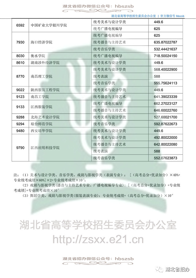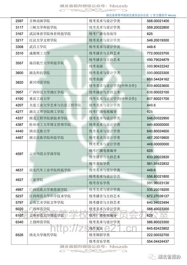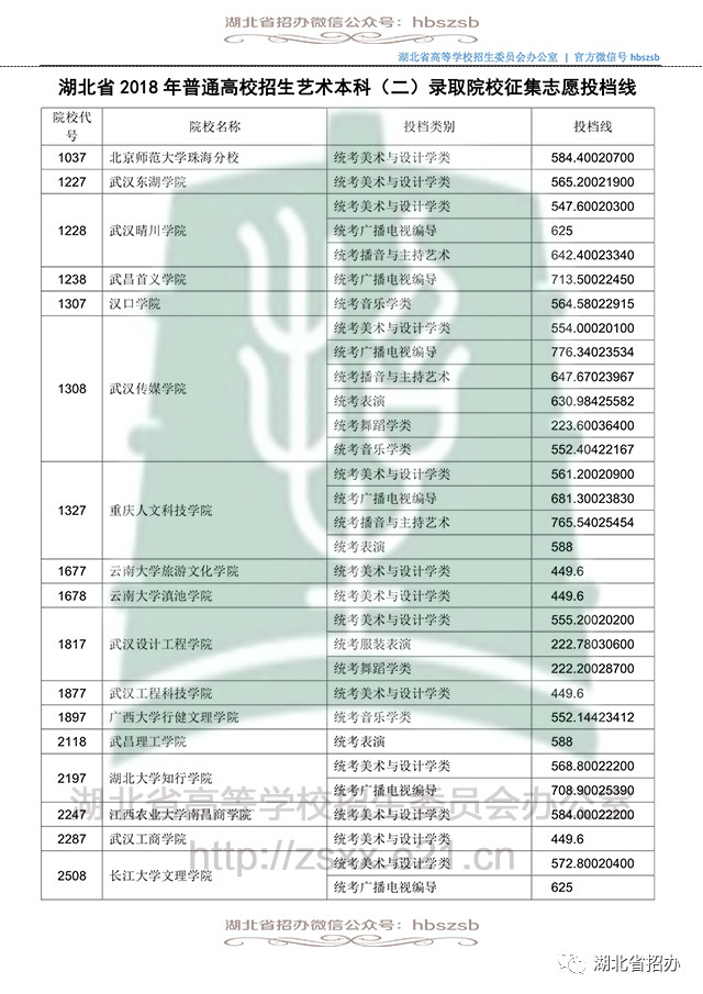 湖北省2018年普通高校招生艺术本科(二)录取院校征集志愿投档线