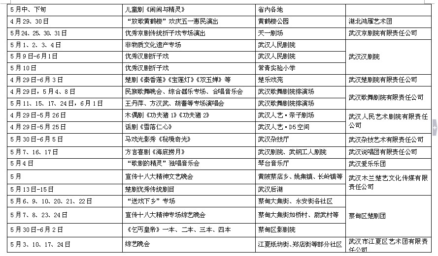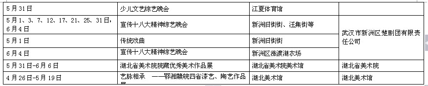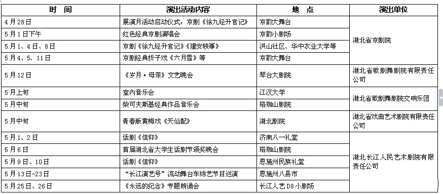 2013年是全面贯彻落实党的十八大精神的开局之年,是实施“十二五”规划承前启后的关键之年,是落实省十次党代会精神、抢抓“黄金十年”战略机遇、推进“五个湖北”建设的重要一年,为加快推进湖北文化强省建设,同时也为我省经济社会发展营造良好的社会文化氛围,省文化厅定于4月底至6月初组织开展“学习贯彻十八大、争创发展新业绩”湖北省优秀剧目、优秀美术作品展演月活动,全省近100个文艺院团、近40家美术展览单位、6000余名文艺工作者将深入城乡社区、乡镇村落、剧院和广场、军营和学校等地,为广大人民群众奉献1061场文艺演出和34场美术展览活动。现将展演月活动安排(节选)刊载如下: