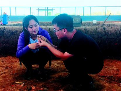 图为:吴映蓁与同在屈家岭实习的学生交流。