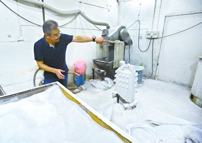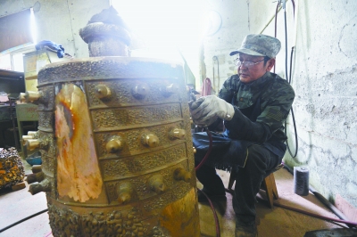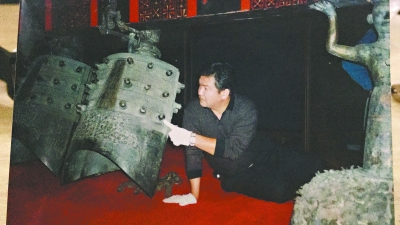 此图为1997年,李明安在曾侯乙编钟原件上翻模现场图片(图片由李明安提供)