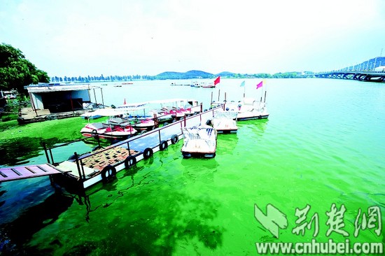 楚天都市报讯 昨日,记者在风光村周边看到,东湖子湖之一的官桥湖湖面出现大量蓝藻,好似一块漂浮的油布。湖水就像黏稠的绿色油漆,浑浊还散发腥臭味,一些死鱼浮于水面,湖中的游船无人问津。
