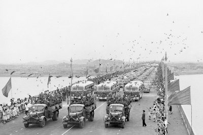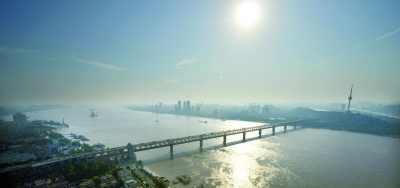 昨日,长江上笼罩着一层薄雾,武汉长江大桥像黑色的钢铁巨龙横跨江面。桥面上车流滚滚,一列火车拖着长长的车身在桥上驰过,江中一艘大货轮从桥下缓缓穿过,向上游驶去。