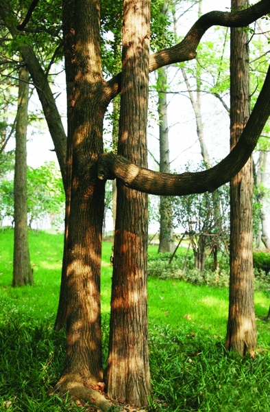 网友“whghm”发帖:漫步东湖风景区,发现在一片水杉树林中有一株樟树的树枝如同伸出的双臂在深情地拥着一株水杉树。