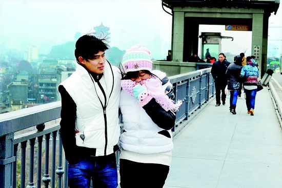 昨日下午,长江大桥上,一对年轻情侣顶着大风相偎前行。受较强冷空气南下影响,我省气象部门昨日发布了2013年第一个气象预警——大风蓝色预警。北风迅速吹冷三镇,气象部门预报,小雨雪明日将再降江城。 北风劲吹,路人缩脖疾行 (记者曹大鹏摄)
