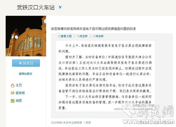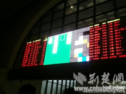 荆楚网消息(记者 张城)1月22日上午,有网友在新浪微博爆料称,汉口火车站高架候车室的电子显示屏出现了“玩纸牌”的画面。下午,汉口火车站官方微博回应,电子屏调试期出现上述问题,将对相关责任人员进行严肃处理。