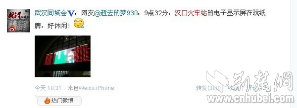 22日上午,网友“逝去的梦930”微博曝料,上午9点32分,在汉口火车站候车,发现火车站内高架候车室的电子显示屏出现“玩纸牌”的画面,并配发当时拍摄的图片。