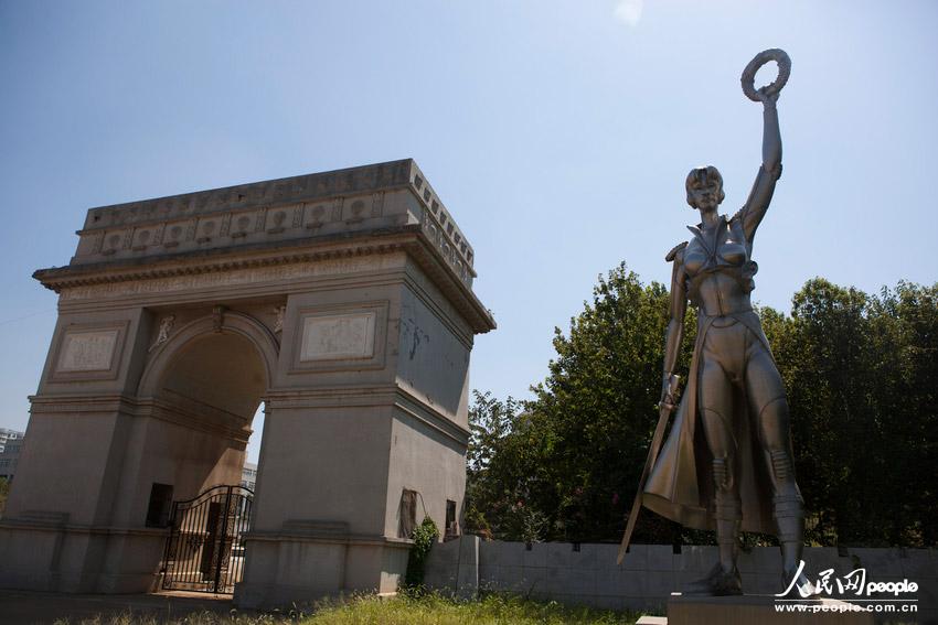 2013年8月9日,湖北武汉商贸职业学院内矗立着仿造各国的文明建筑,位于校门口的智慧女神像和凯旋门。李鹏/东方IC