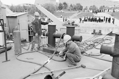 郭忠林介绍,浮吊工程趸船为葛洲坝建设、丹江大坝建设立下汗马功劳,葛洲坝的设备都是通过这个工程浮吊趸船运载的。后来趸船迁移到国博330码头后,主要是卸载重型车辆和机器设备。近几年,该船一直被闲置。