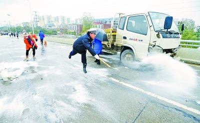 市城管委主任张军在昨天的融雪防冻视频调度会上分析,目前我市道路桥梁融雪除冰大多使用工业盐,消融积雪效果较好,但用于硬度较大的道路结冰却不太理想,不仅化冰速度慢,维持时间也不长。加上前天夜间持续下小雨,路面反复结冰,桥面上的盐在风吹雨打中不断被稀释和吹散。因此尽管城管部门连夜组织力量上路,对发现结冰的路面进行了除冰处理,早高峰时段过江桥梁和城市环线桥梁仍然有部分路面结冰。