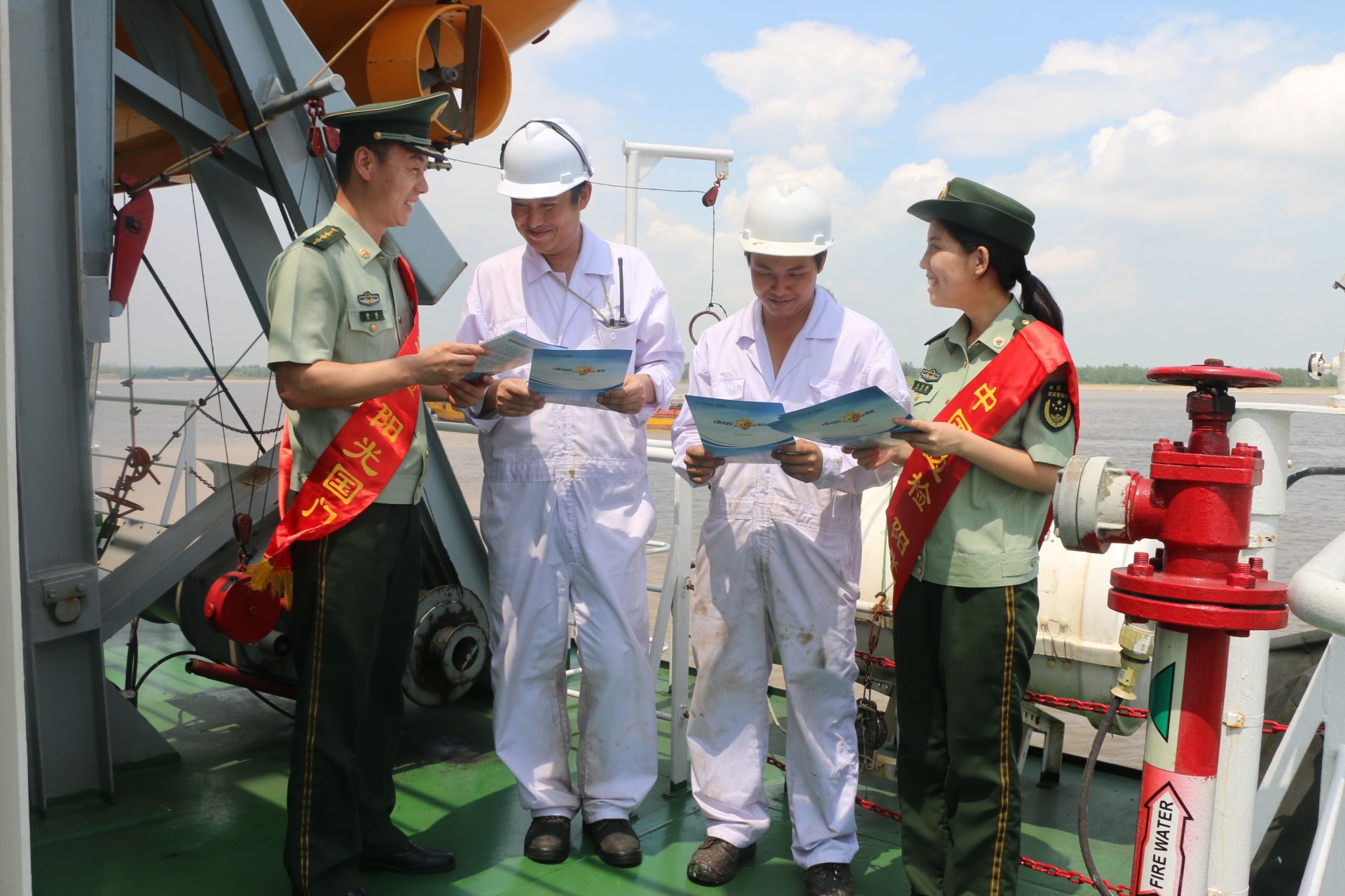 在外贸码头执勤现场,汉口边检站官兵向船员发放国家移民管理局5项便民利民服务举措的宣传资料,利用展板、易拉宝等宣传媒介详细介绍5项新政之一的“实行国际航行船舶网上申报边检手续”。官兵们还向服务对象耐心讲解该站“360服务法”、24小时通过制度、国际贸易“单一窗口”等网上办事平台。