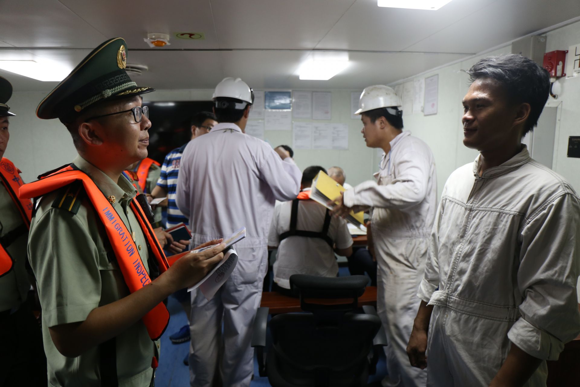 图为汉口边检站官兵向船员宣讲国家移民管理局最新便民利民措施。记者汪文汉摄