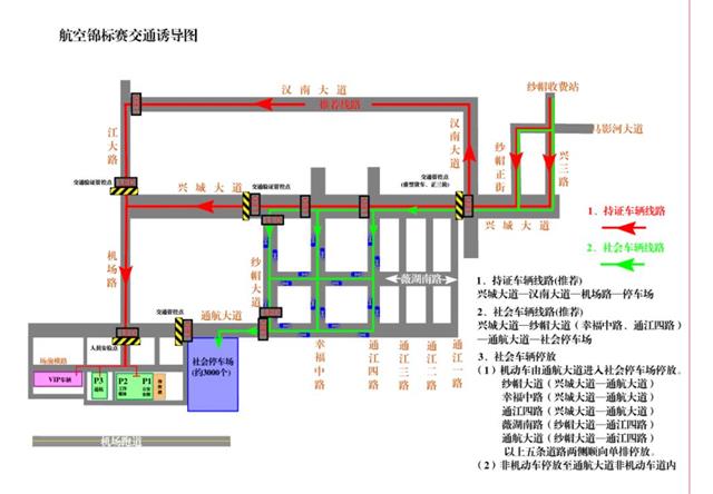4、持大赛通行证车辆由兴城大道—汉南大道—江大路—机场路—场前路分别进入相应停车场。