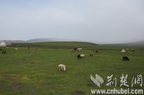那拉提草原上,成群的牛羊正闲适地吃着草