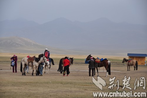 巴音布鲁克草原上,来此旅游的人们骑马体验牧民的生活