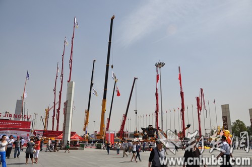 重型工程机械车辆长长的吊臂很壮观,但参观者甚少