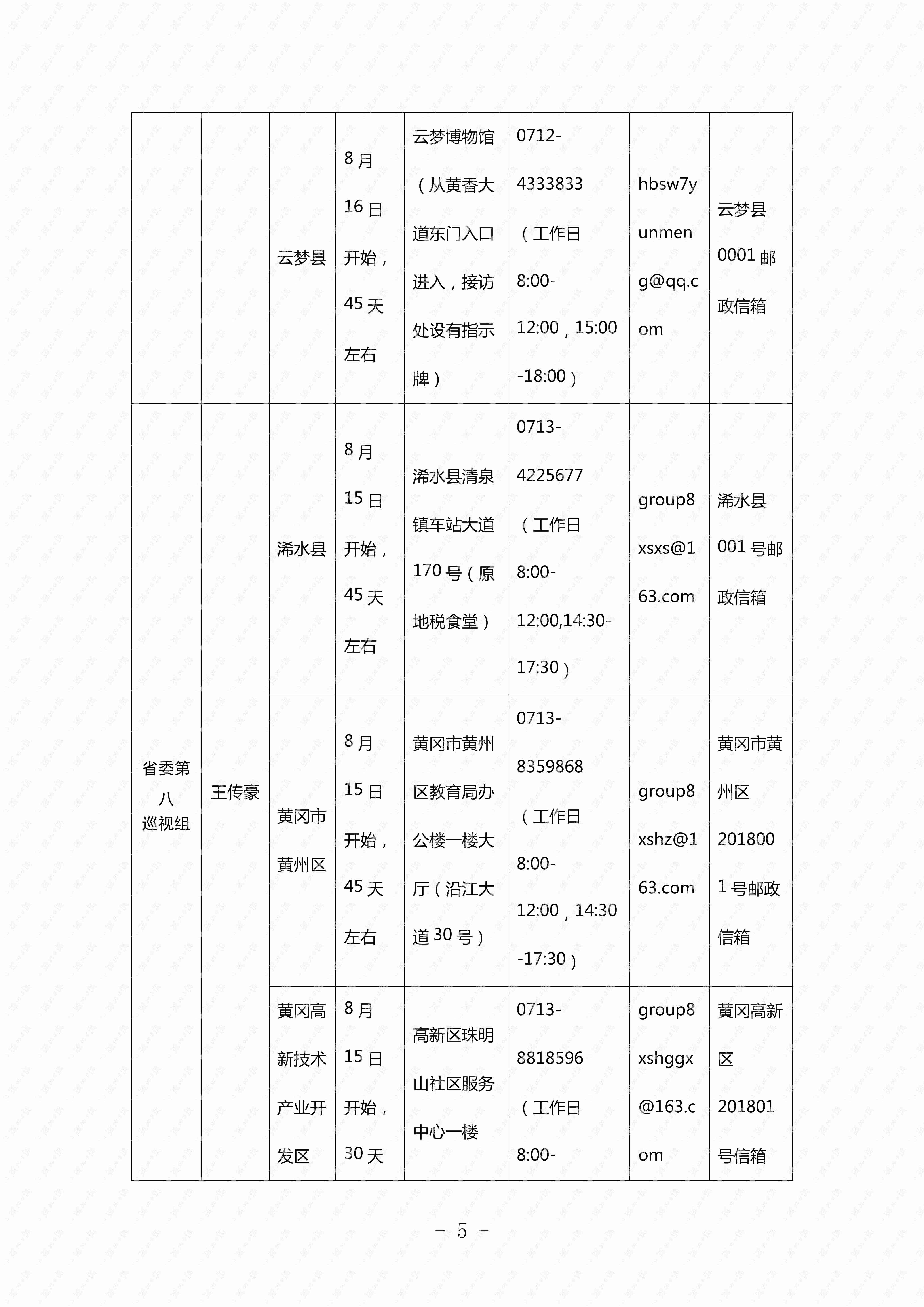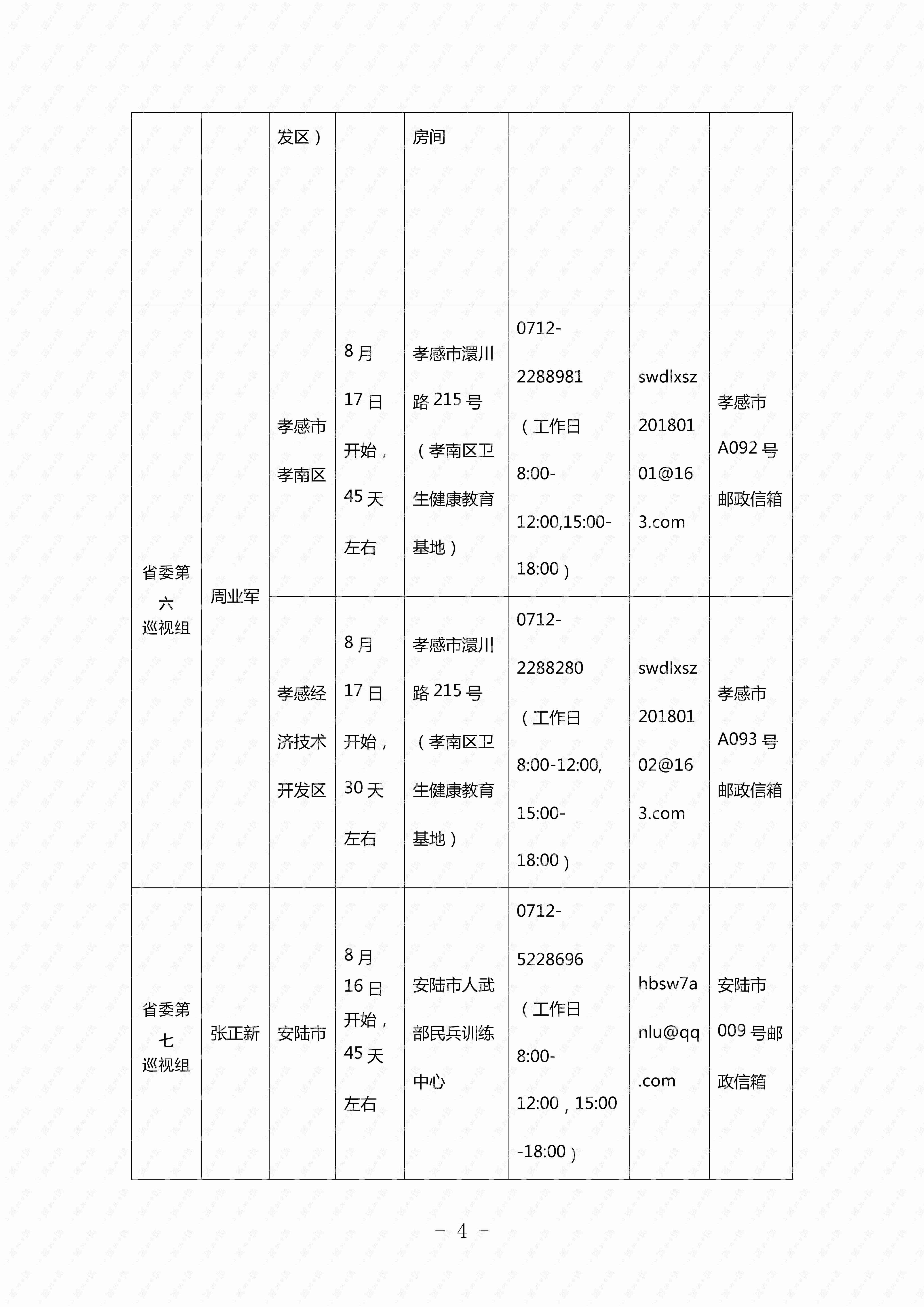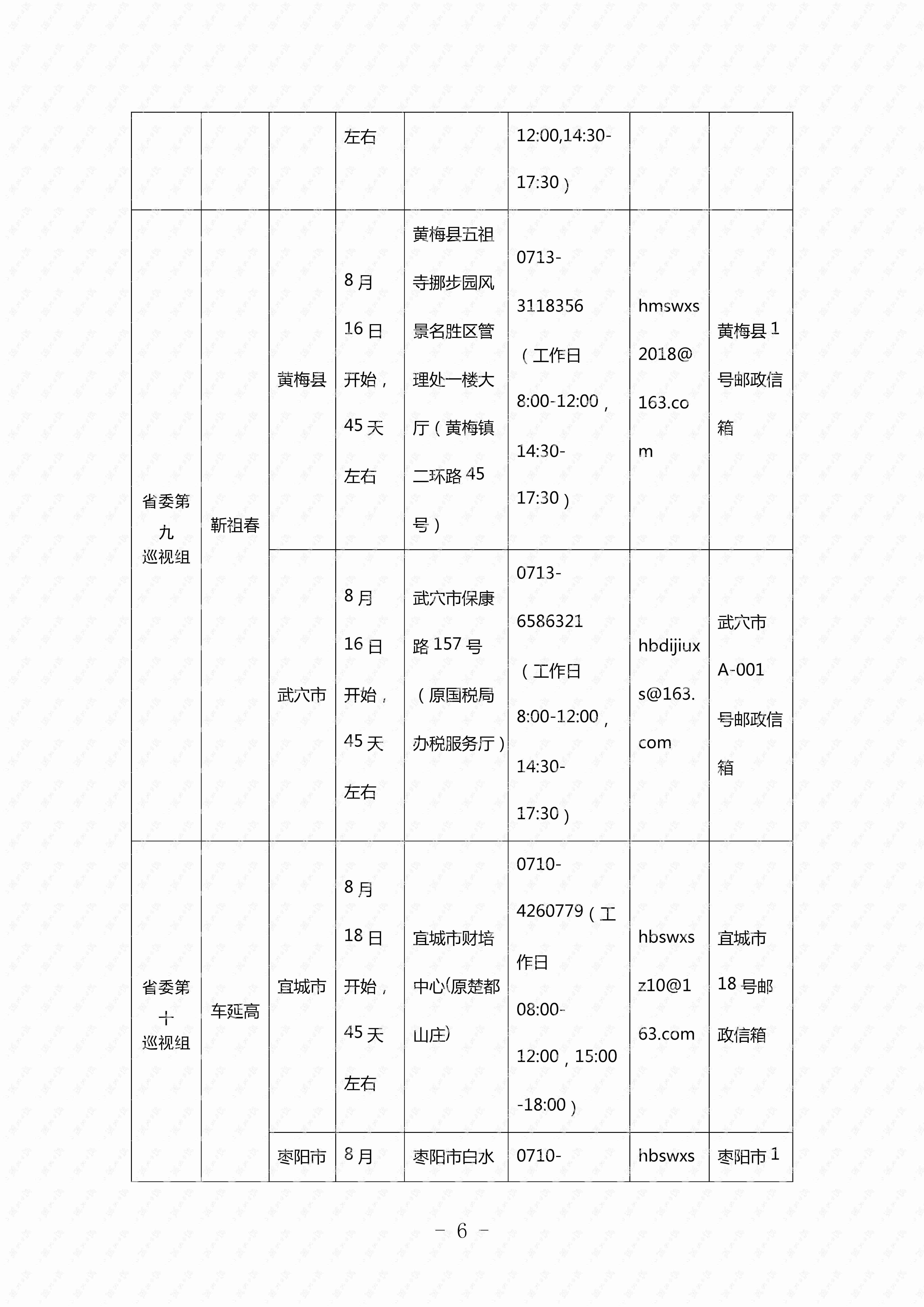 本轮巡视还将结合近期中央和省委重大决策部署,重点了解习近平总书记今年4月视察湖北重要讲话精神贯彻落实情况、“三大攻坚战”中不担当不作为情况、被巡视地区政治生态情况。与上轮巡视一样,在开展常规巡视的同时,省委各巡视组还将会同省委组织部、省委宣传部、省委巡视办、省扶贫办等部门,抽调专人组建专班,开展选人用人和干部担当作为、基层党组织建设、意识形态工作责任制落实、精准扶贫脱贫攻坚、巡察工作情况等五个专项检查。