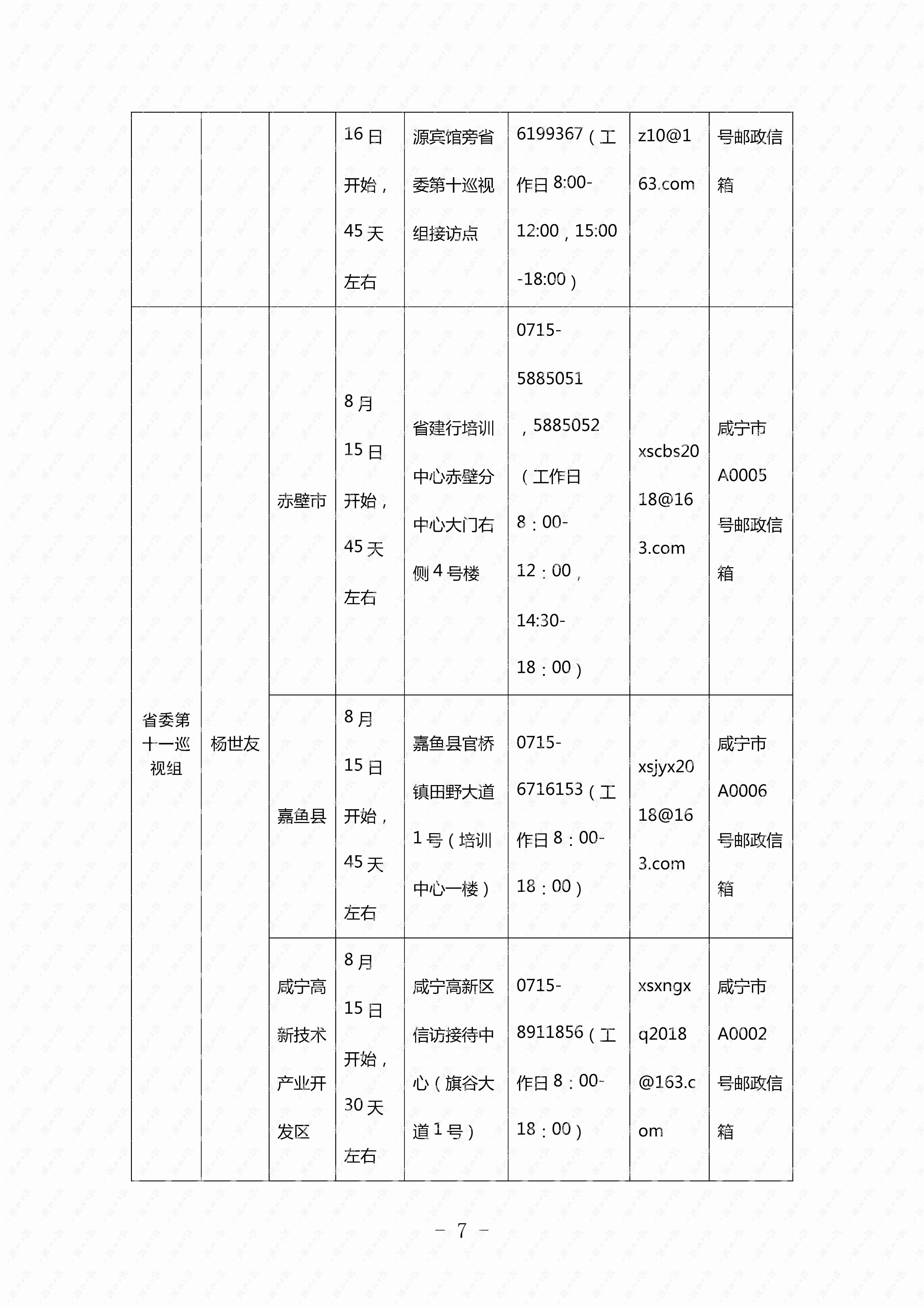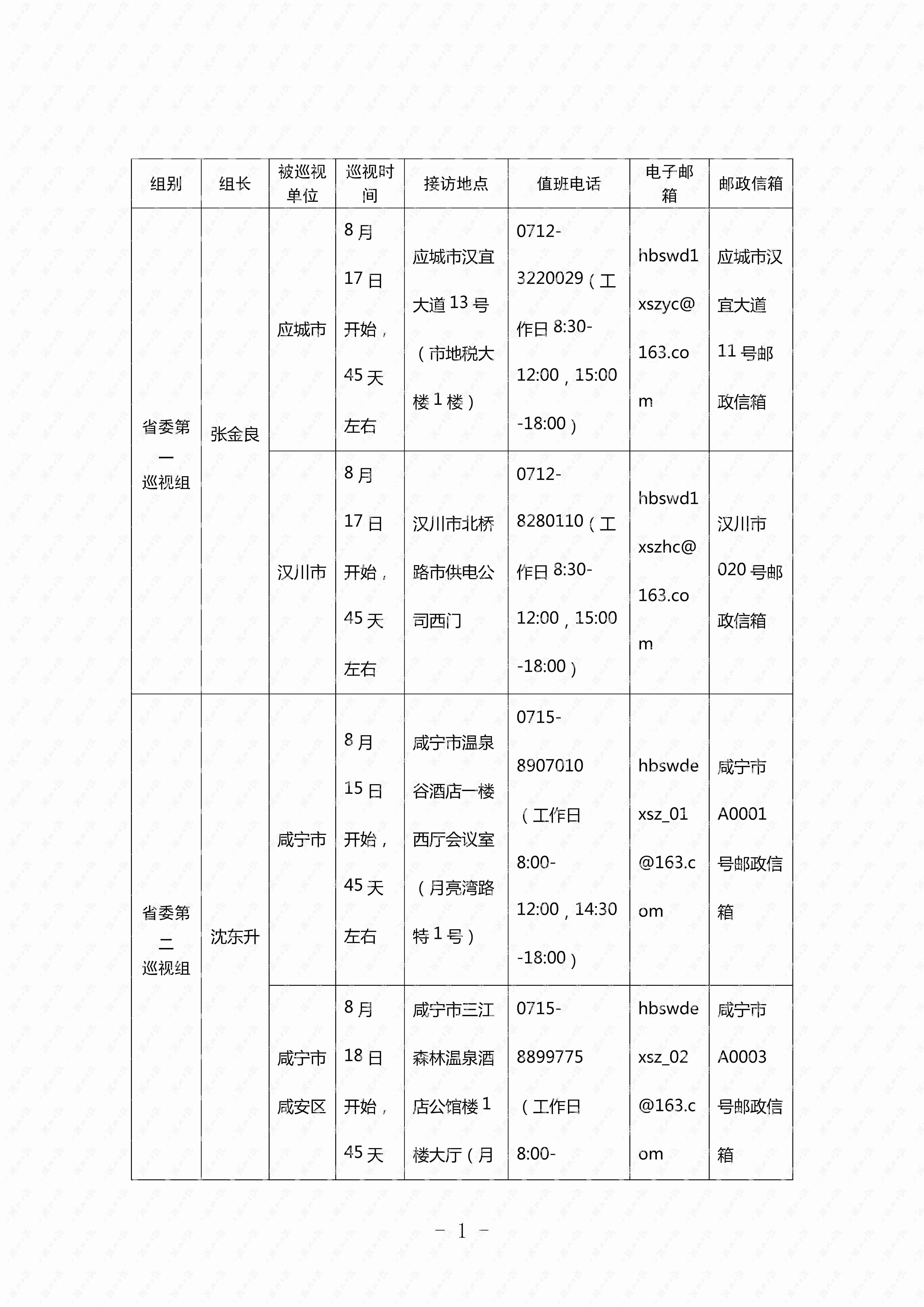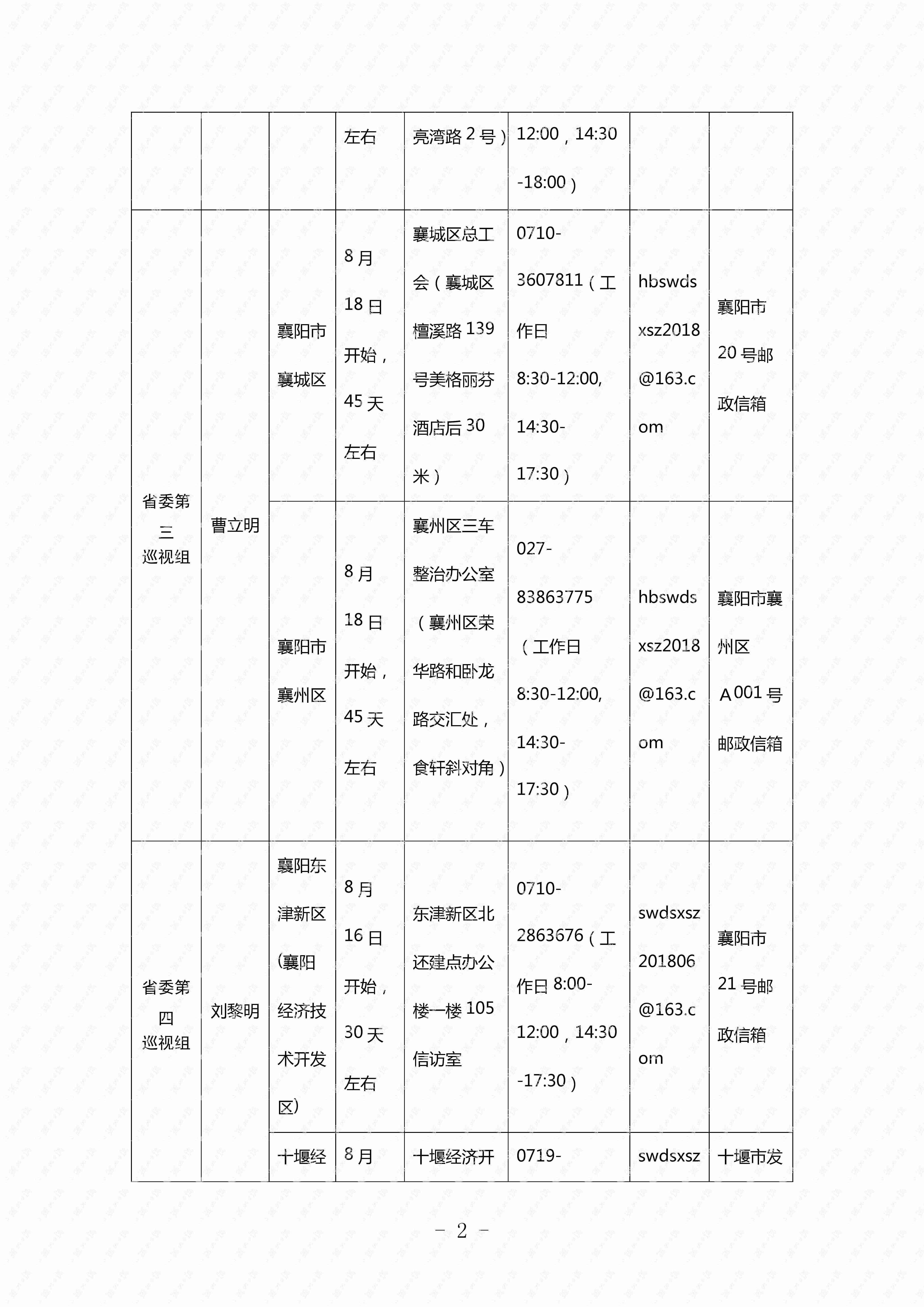 本轮巡视还将结合近期中央和省委重大决策部署,重点了解习近平总书记今年4月视察湖北重要讲话精神贯彻落实情况、“三大攻坚战”中不担当不作为情况、被巡视地区政治生态情况。与上轮巡视一样,在开展常规巡视的同时,省委各巡视组还将会同省委组织部、省委宣传部、省委巡视办、省扶贫办等部门,抽调专人组建专班,开展选人用人和干部担当作为、基层党组织建设、意识形态工作责任制落实、精准扶贫脱贫攻坚、巡察工作情况等五个专项检查。