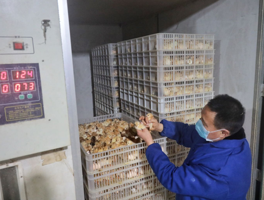 韩培兆检查正在孵化的4万羽鸡苗。