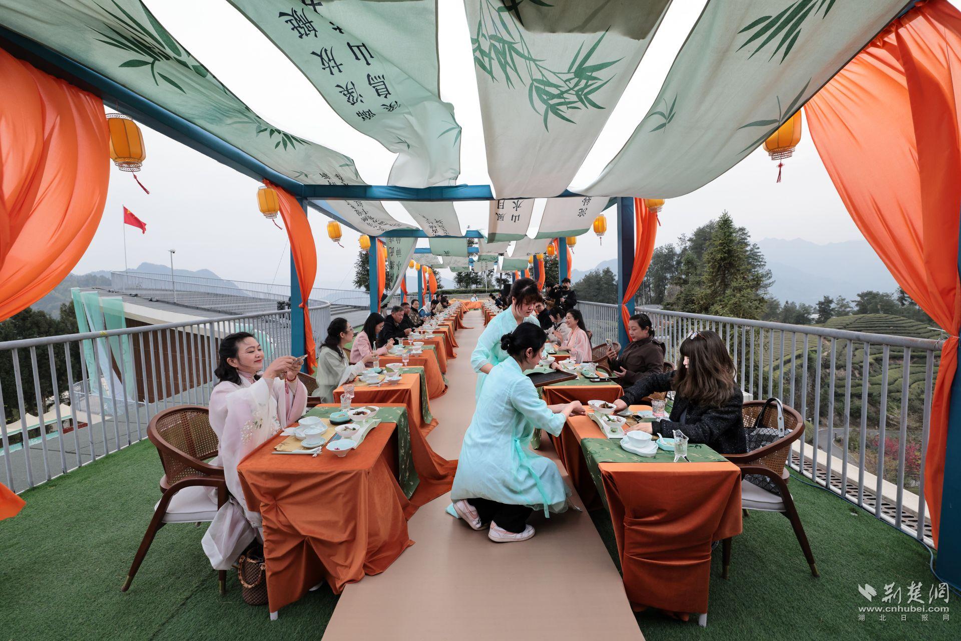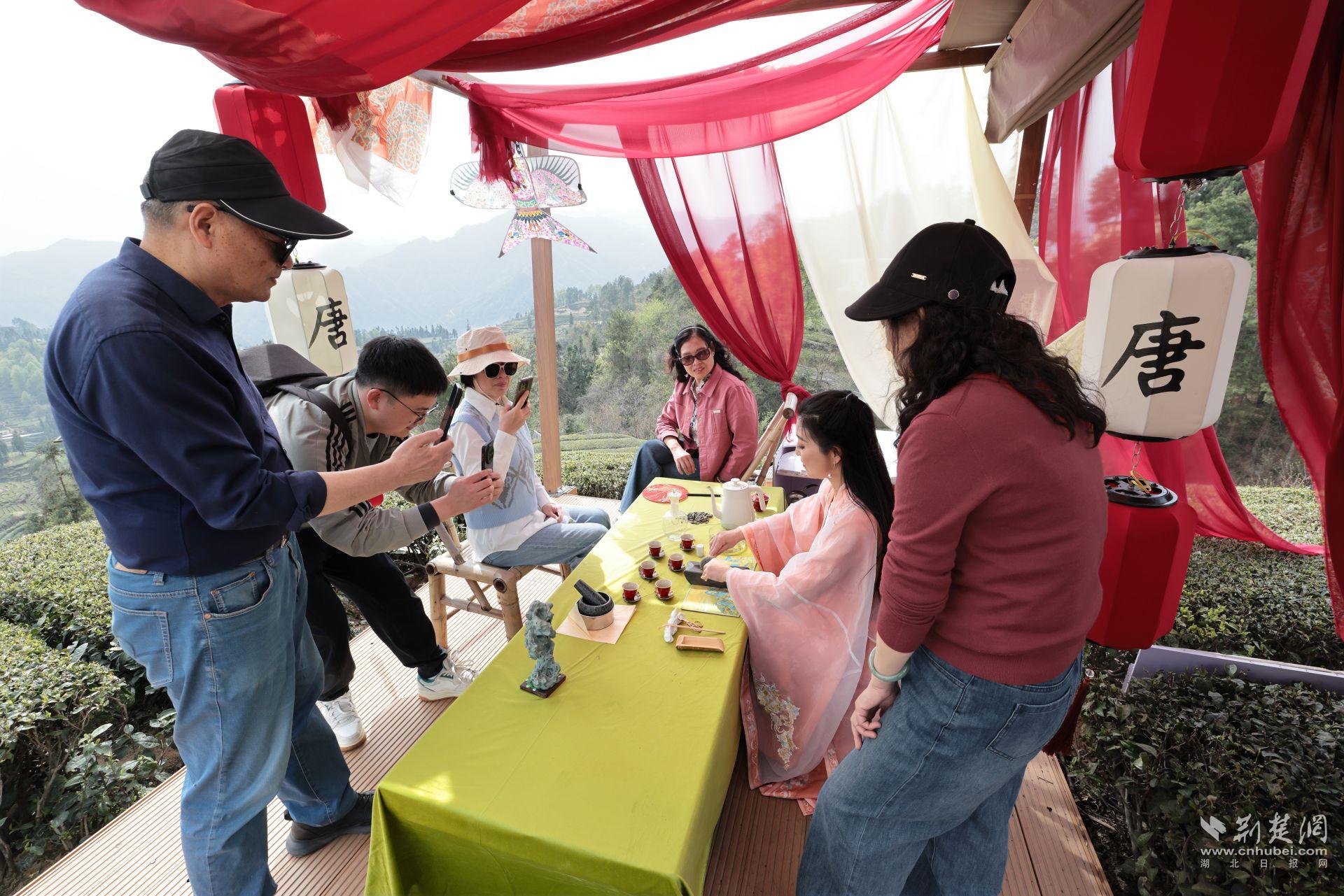 三峡茶旅小镇和宜昌市茶艺协会联合举办“春日盛.茶山醒”春茶体验活动,通过喊山、点茶、拓印、茶宴等活动,吸引众多年轻人参与。