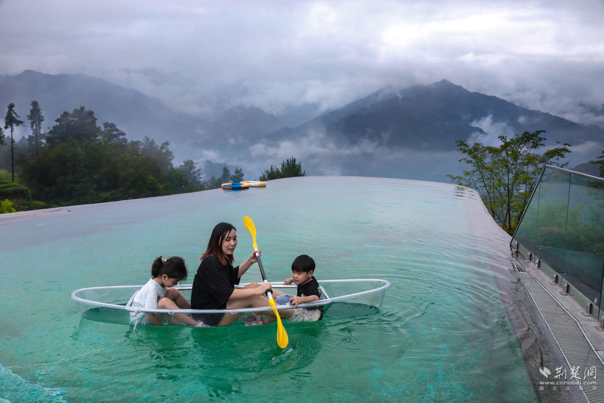 一位妈妈带着两个孩子在海拔1000米的泳池里开心地划船。在亲友的推荐下,他们从深圳来这里渡假。