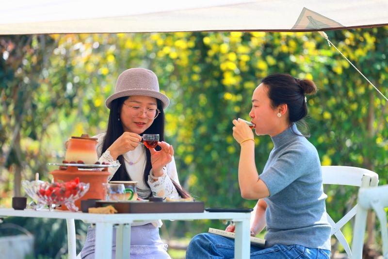 每逢周末或夜晚,前来打卡的游客络绎不绝,他们或交谈、或制作陶艺、或品尝咖啡、或着汉服拍照,更多的则是望着田园花乡遐想发呆,放空自己,给这片安静的区域带来了十足的朝气。