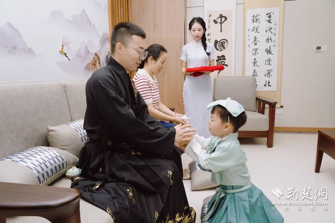 最温馨感人的当属奉茶仪式。在工作人员的引导下,孩子们双手端起泡好的养生茶,恭恭敬敬地递给父母,并说一句感恩的话语:“妈妈辛苦了”“爸爸我爱你”,家长们接过茶,脸上露出了感动的笑容,纷纷回赠孩子一个温暖的拥抱。这小小的一杯茶,承载着孩子们对父母的感恩之心,也传递着“孝亲敬老”的传统美德。