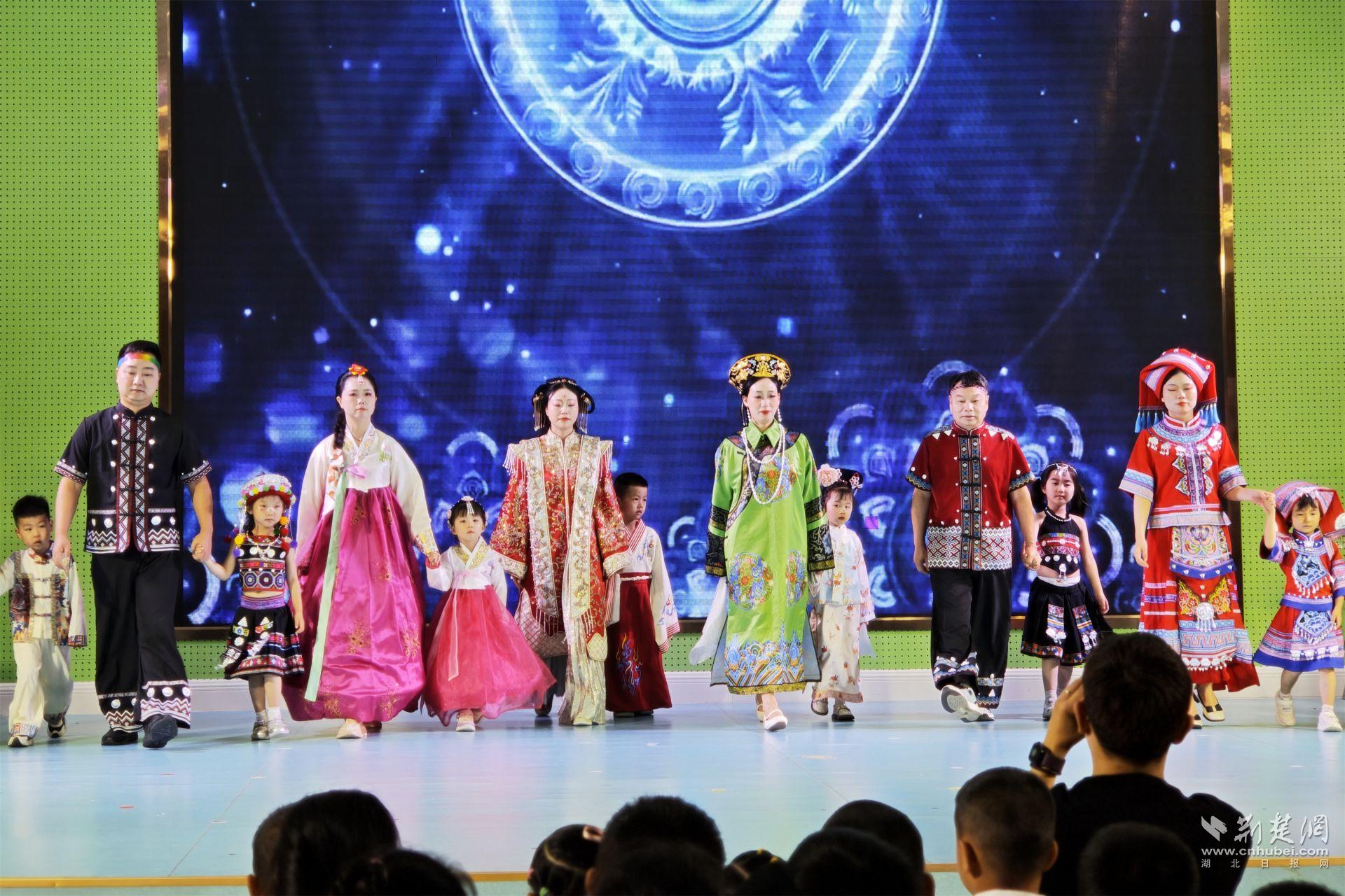 活动现场,夷陵区直属机关幼儿园黄金卡分园礼堂里热闹非凡,身着民族服饰的萌娃们拿着专属“时空护照”开启了时空长廊的穿越之旅。师幼将《石榴花开》《西域铃鼓》等富有不同民族特色的节目搬上舞台,幕布后的光影交错间,文化交融的深意悄然传递。