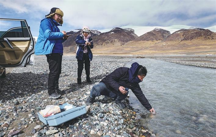 南京水利科学院科技工作者在沱沱河取河水样本。