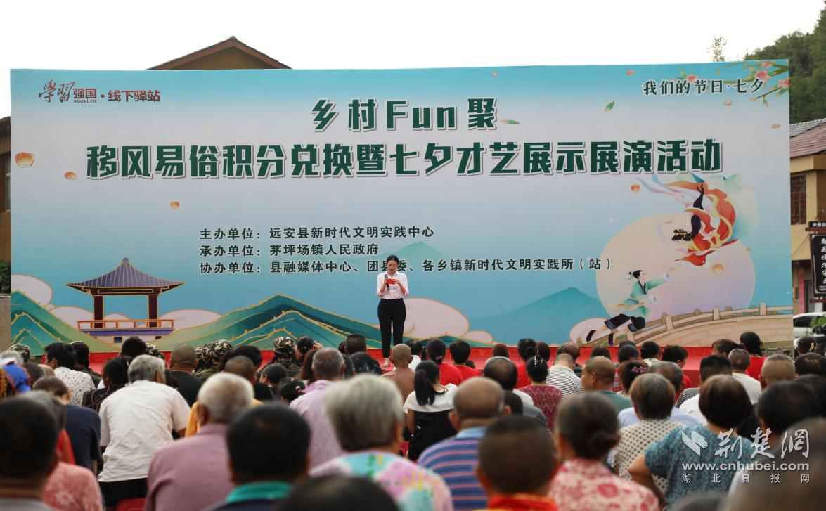 荆楚网(湖北日报网)讯(通讯员陈步云)8月29日下午,远安县“乡村Fun聚——移风易俗积分兑换暨七夕才艺展示展演活动”在茅坪场镇九龙村杨家脚广场成功举办。活动由远安县新时代文明实践中心主办,茅坪场镇人民政府承办,县融媒体中心、团县委及各新时代文明实践所(站)协办,吸引近1200余名群众参与。现场人头攒动、笑语不断,舞台灯光璀璨,背景板上的“文明乡风 幸福远安”字样在夕阳下格外醒目。