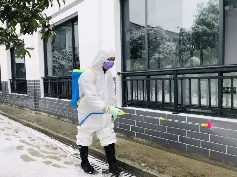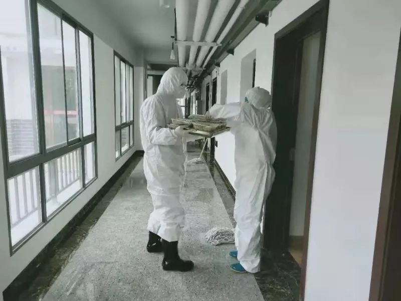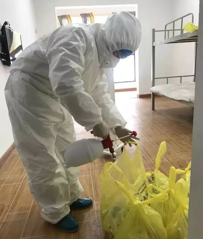 和两名医护人员并肩作战的,还有52岁的牛庄村村民、曾在宜昌市二医院担任护工的王德贵。“我有经验,我不来谁来?万一我感染了,把我老娘照顾好就行。”王德贵由上至下、由左至右地把消毒药水喷洒到留观中心各处,在开关、把手等细微之处停留的时间格外长,不一会儿,满满一桶药水已经用去一大半……