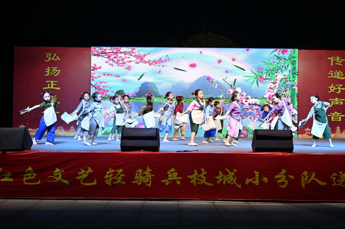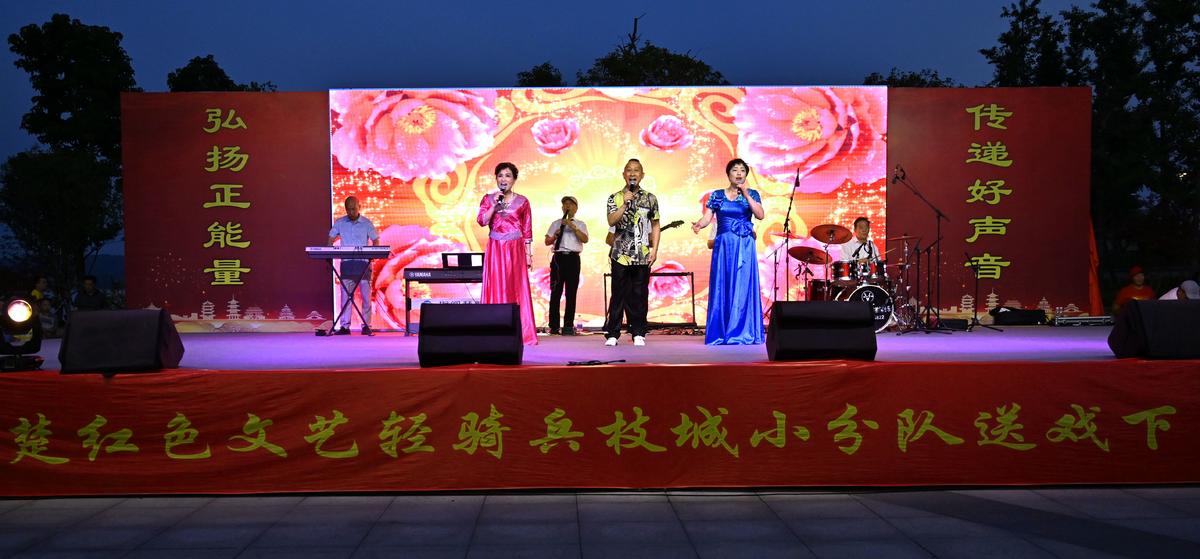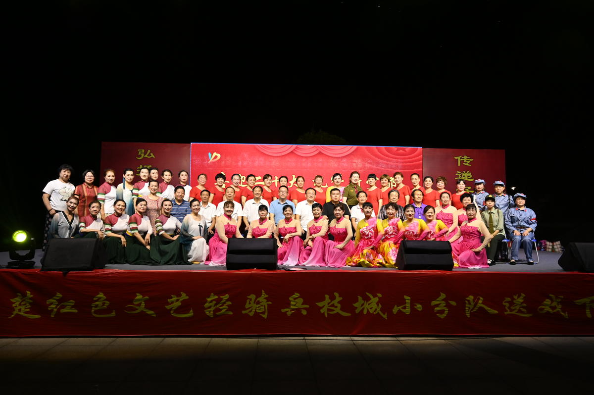 当晚,文艺晚会在枝城镇朝阳广场正式开始,气势恢宏的歌舞表演《走进新时代》《我爱你中国》《祝福祖国》,激情奔涌的大鼓《走在大路上》,刚柔相济宛转悠扬的瑜伽表演《青花瓷》《这世界那么多人》,还有活力四射的舞蹈《小报童的歌》。宜都民协以及市音协、两江潮、追乐歌舞团等社会组织的居民群众、文艺骨干、党员队伍们,以歌声和舞姿祝福祖国繁荣昌盛,人民幸福美满。